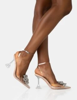 Vibez Silver Mirror Metallic Diamante Flower Broach Strappy Perspex Cake Stand Pointed Toe Heels