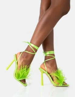 Iconic Lime Satin & Lime Feather Detail Square Toe High Heels