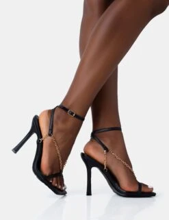 Catwalk Black Pu Chain Strappy Square Toe Stiletto Heels