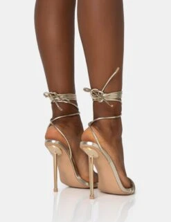 Majesty Nude Patent Buckles Wrap Around Pointed Toe Gold Stiletto Heel