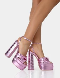 Magnum Pink Metallic PU Knot Strap Platform Diamante Block Heels