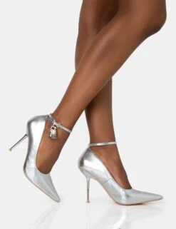 Lotty Metallic Silver Padlock Ankle Detail Pointed Court Stiletto Heels