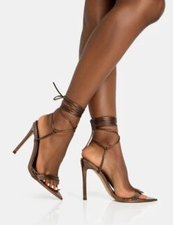 Merlot Metallic Chocolate Lace Up Wrap Around Pointed Toe Stiletto Heel