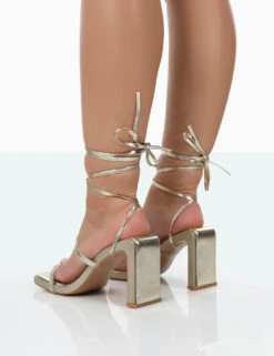 Misha Gold Square Toe Strappy Lace Up Thin Block Heels