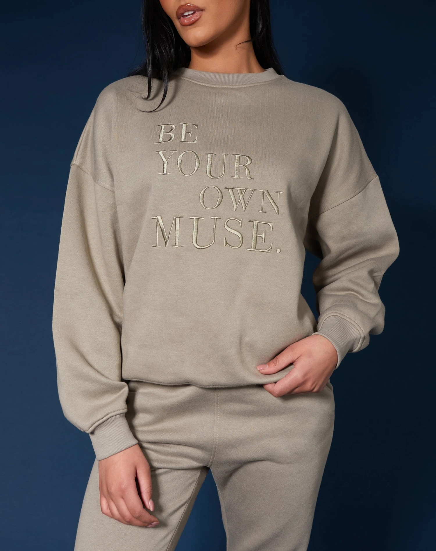 OVERSIZED FIT SWEATSHIRT IN KHAKI WITH TONAL ‘BE YOUR OWN MUSE’ EMBROIDERY