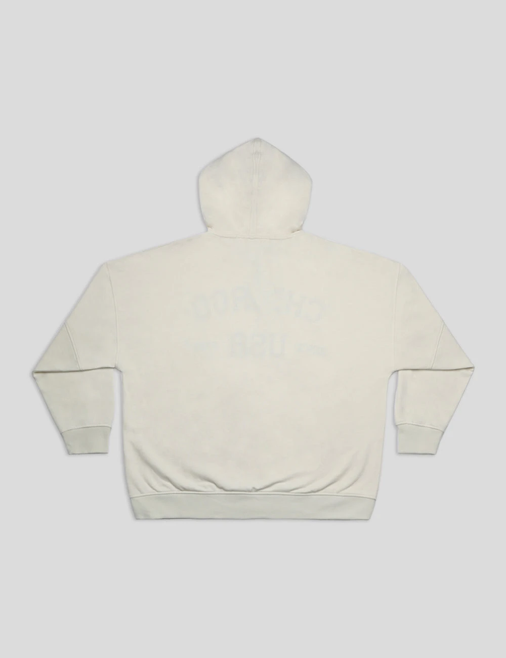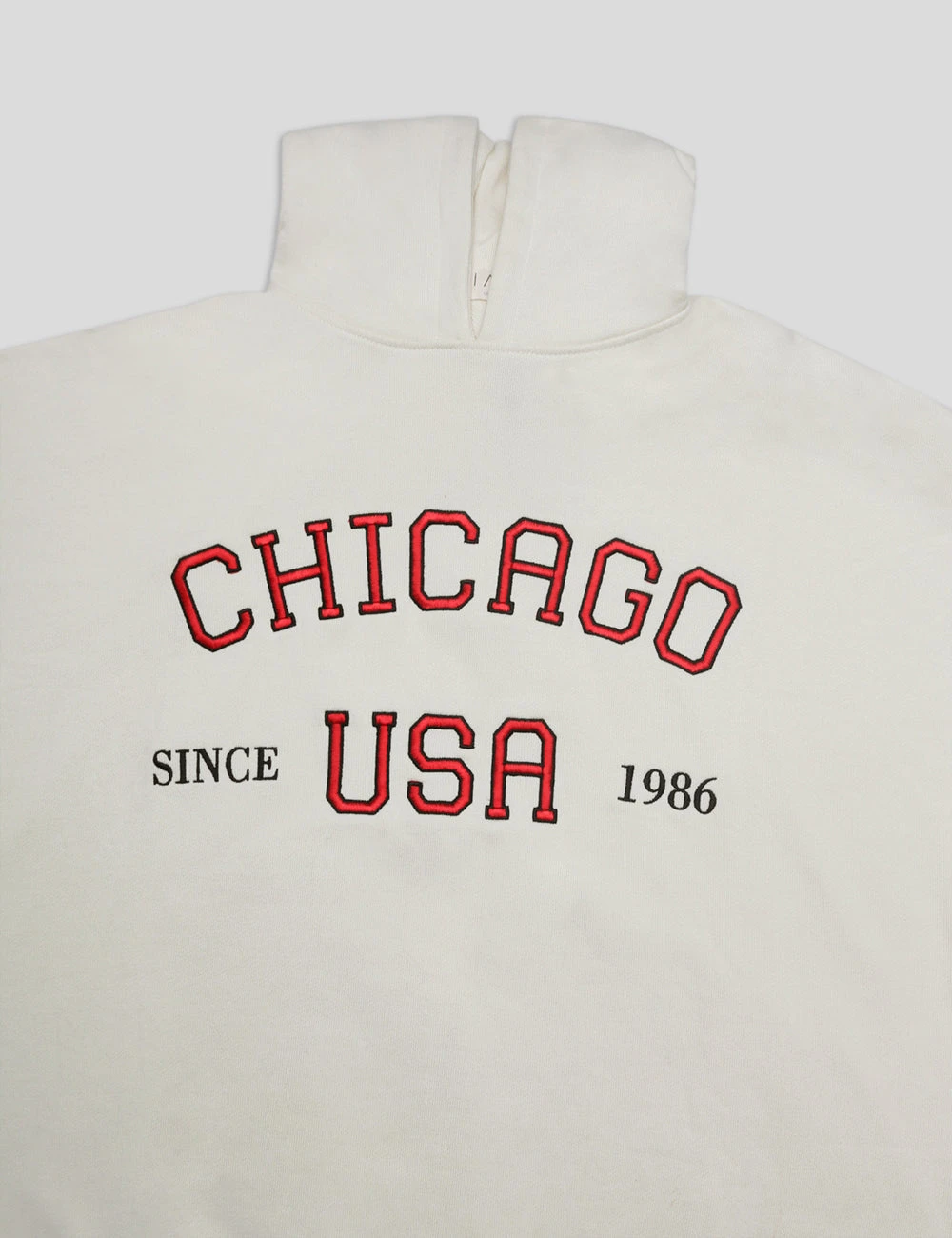 Relaxed fit hoodie featuring ecru material with a ‘Chicago USA’ print graphic design in red and black embroidery. Wear with our best selling split hem cargos for that chilled everyday fit.