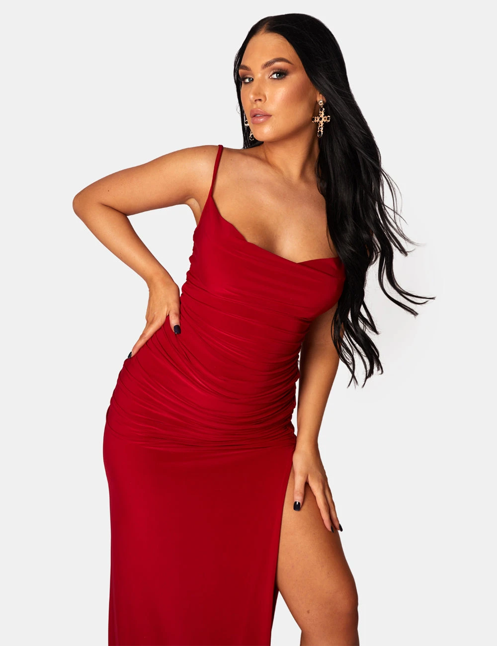 COWL FRONT MAXI DRESS WITH HIGH SPLIT DETAIL IN A SLINKY FABRIC.