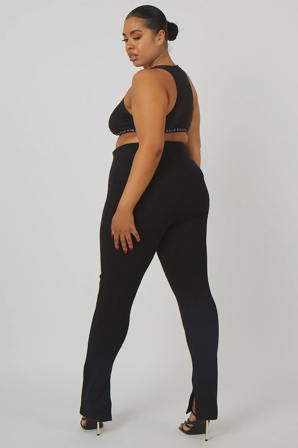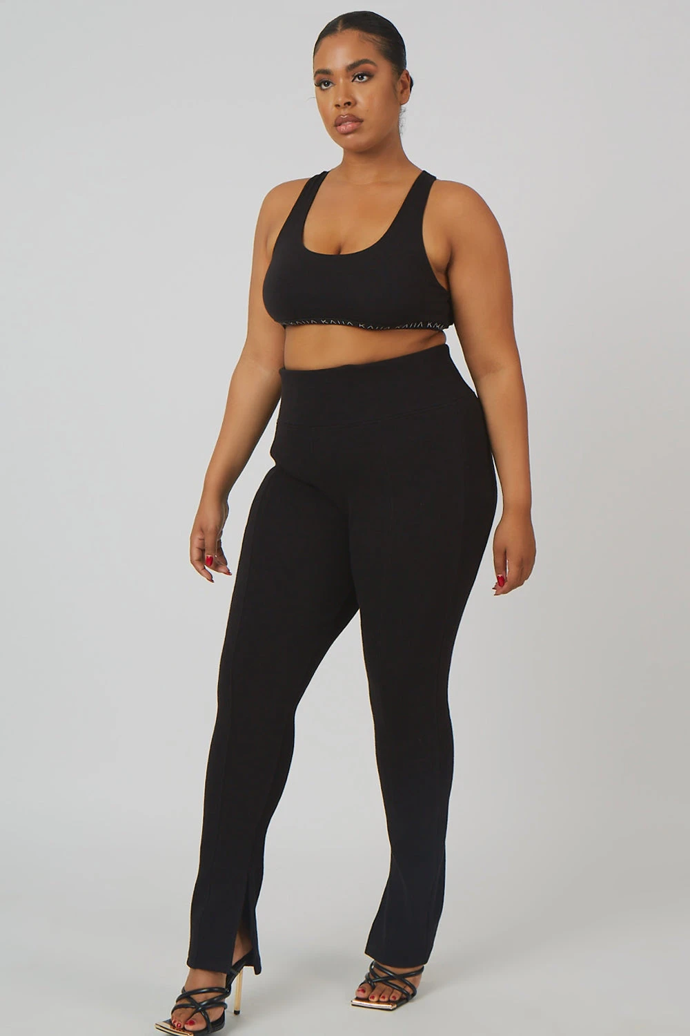 Black high waisted ribbed leggings with a split hem detail.