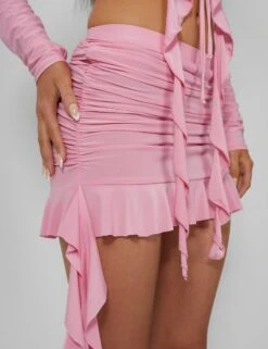Step into our fantasy in bold metallics, sci fi sexy cut out pieces and vibrant prints. Let PD clothing, help you build your wardrobe staples and new favorites with our on trend designs. This frill detail ruched mini skirt in baby pink is the perfect way to embrace you cottage-core fantasy. The ruched material creates a flattering silhouette. The baby pink hue is romantic and feminine, pair with the matching cardigan for a whimsical look. Here at PD HQ we want you to feel your best inside and out. Our clothing is here to take you there!