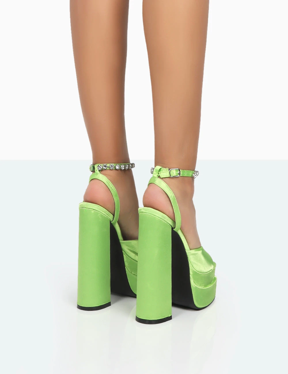 Frozen Lime Satin Sparkly Diamante Strap Open Toe Block Platform Heels