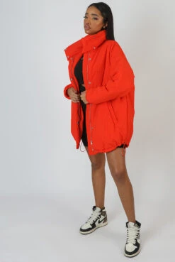 Make a statement with this oversized, high neck puffer jacket in orange featuring a zip fastening.