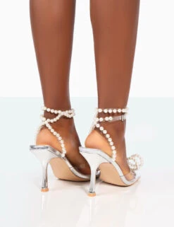 Hope Wide Fit Silver Metallic PU Clear Perspex Bow Strappy Mid Heels