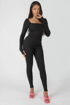 A flattering black ribbed squareneck long sleeve jumpsuit with thumbholes.