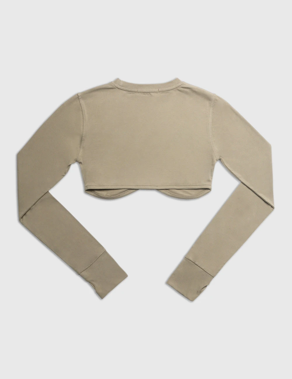 LONG SLEEVE CREW NECK CROP TOP WITH UNDERBUST DETAILING IN ELM KHAKI