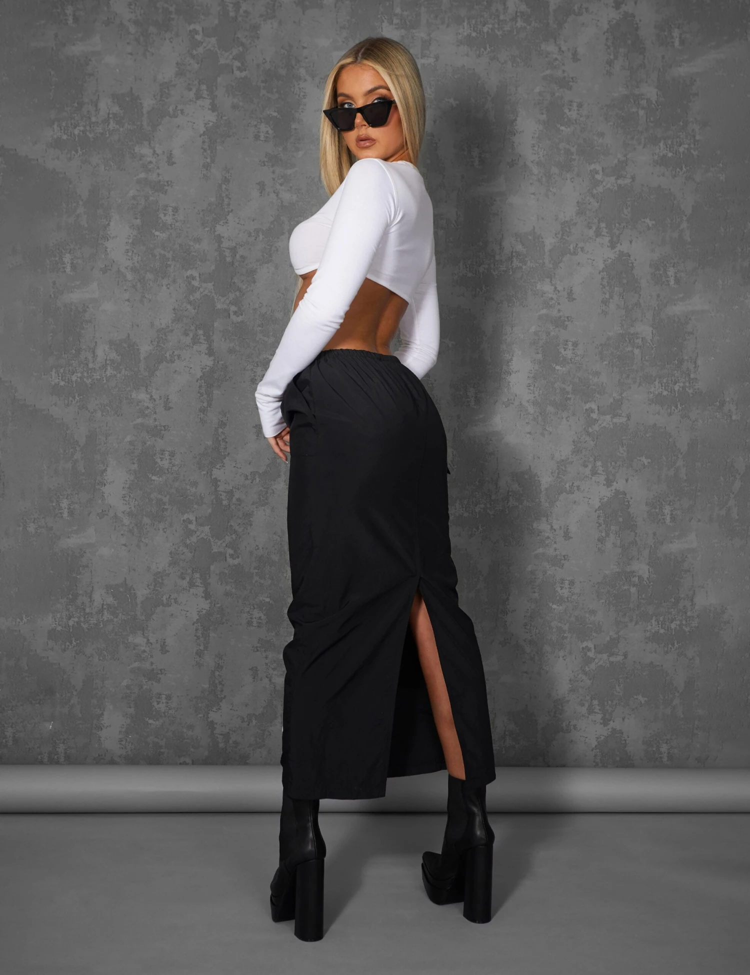 A long sleeve under bust detail super cropped t-shirt in white with thumb hole details.