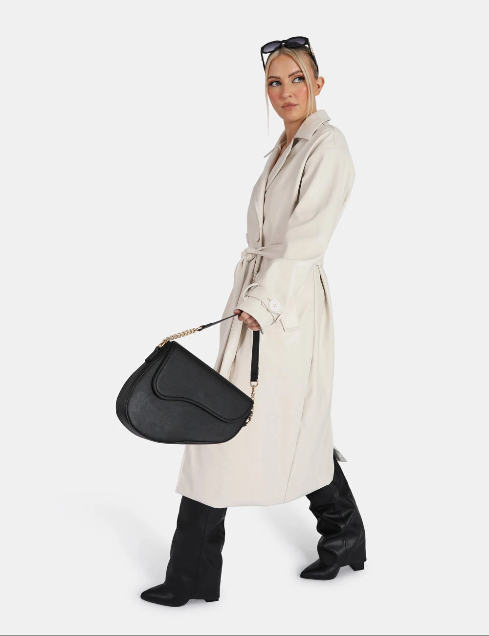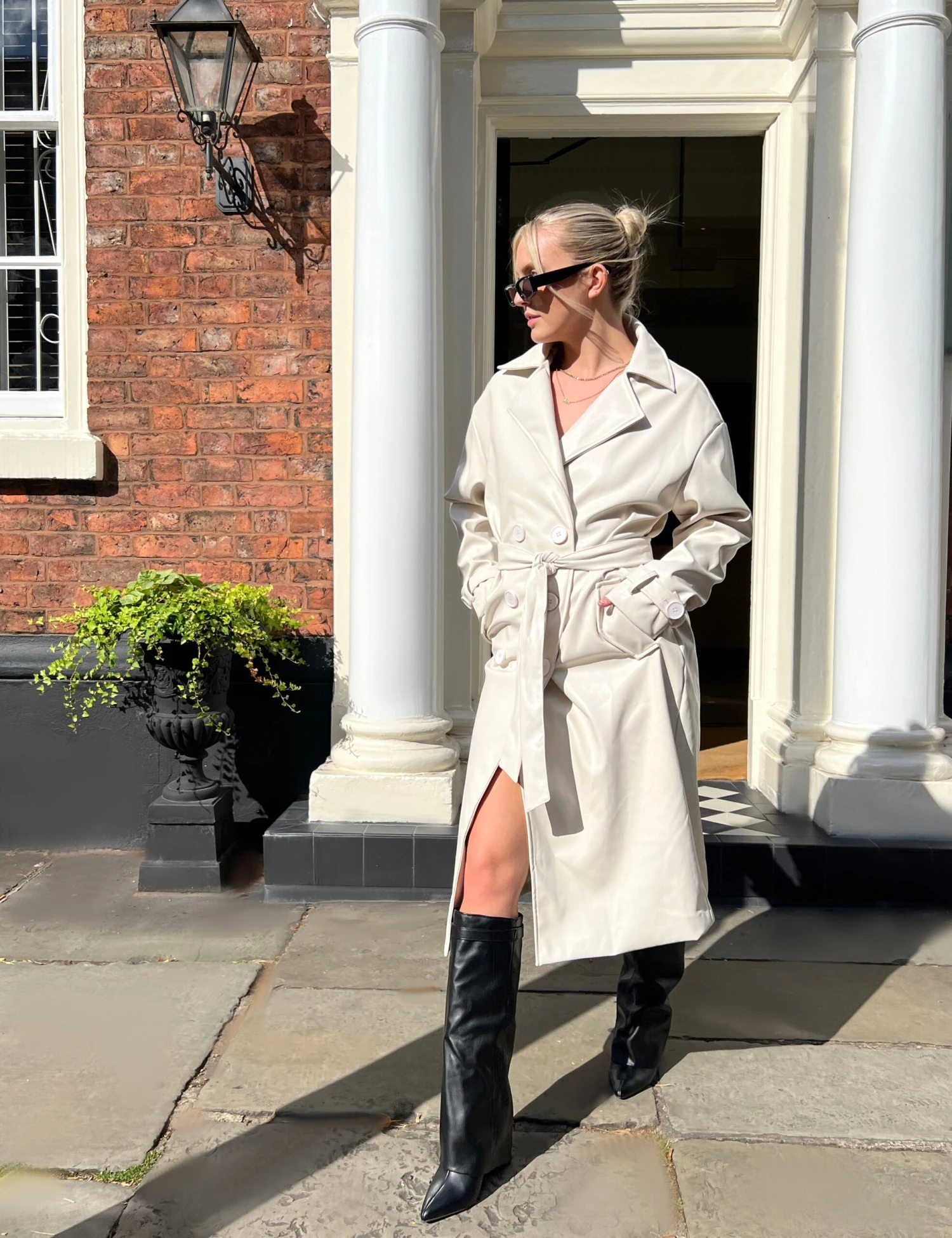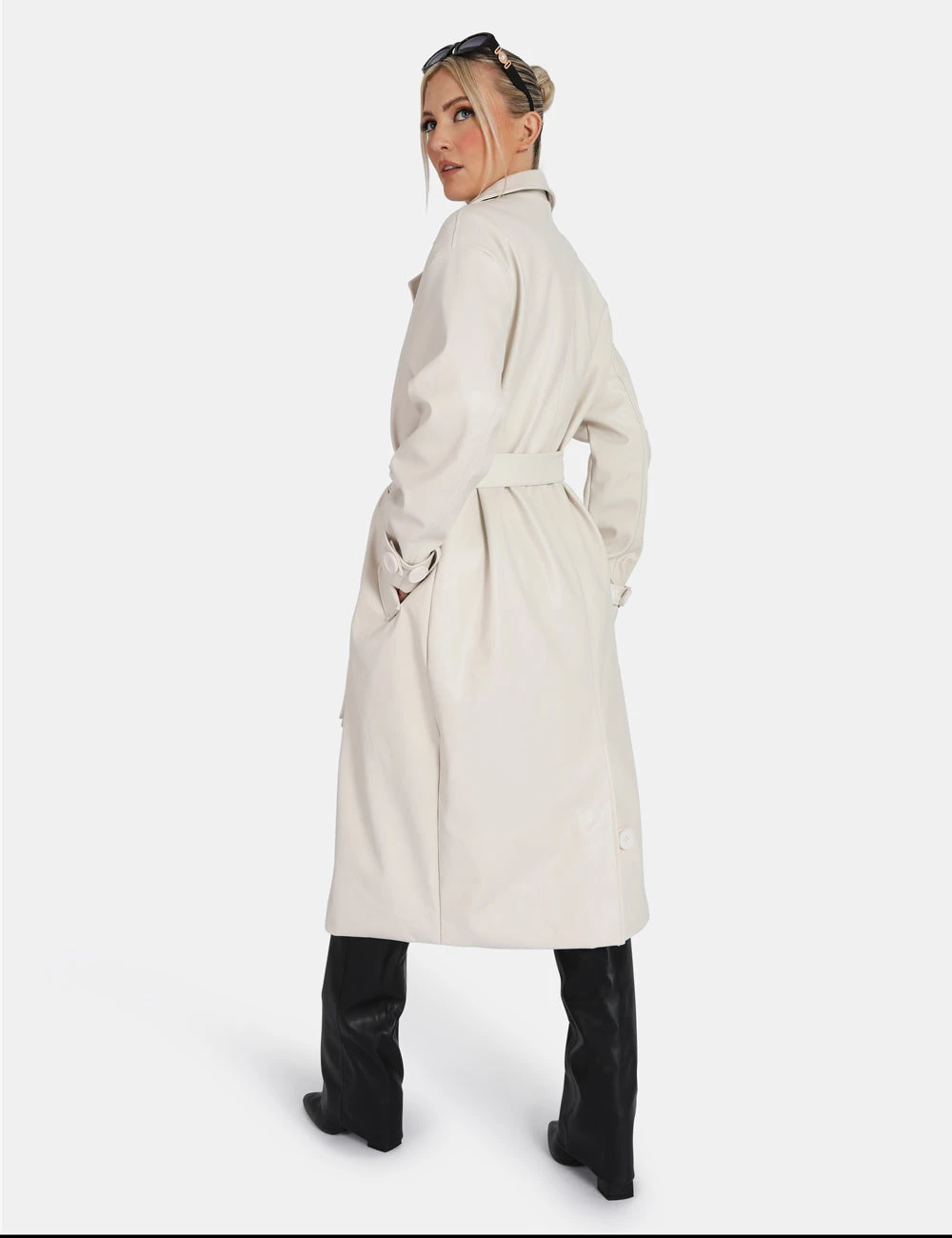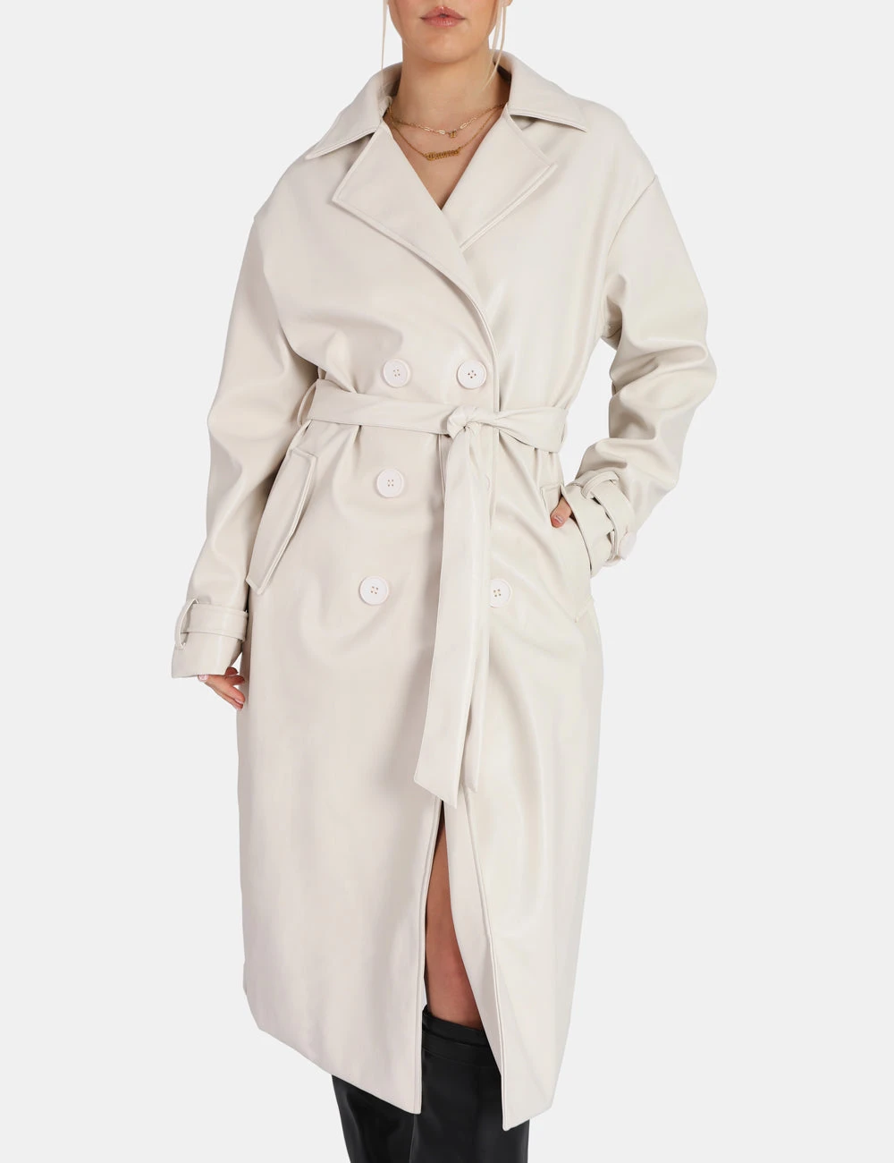 Cant beat a classic, can you? Longline PU ecru trench featuring wrap around belt.
