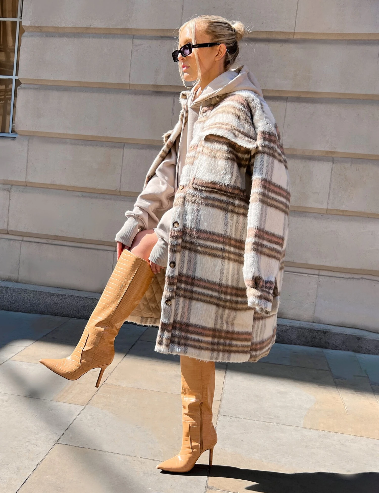 A longline soft touch shacket in a check with quilted lining, button fastenings and front pockets.
