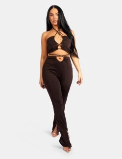 Give your look a seriously chic look with these split hem trousers. Featuring a looped detail high waist and flattering ruching with split hems in chocolate.