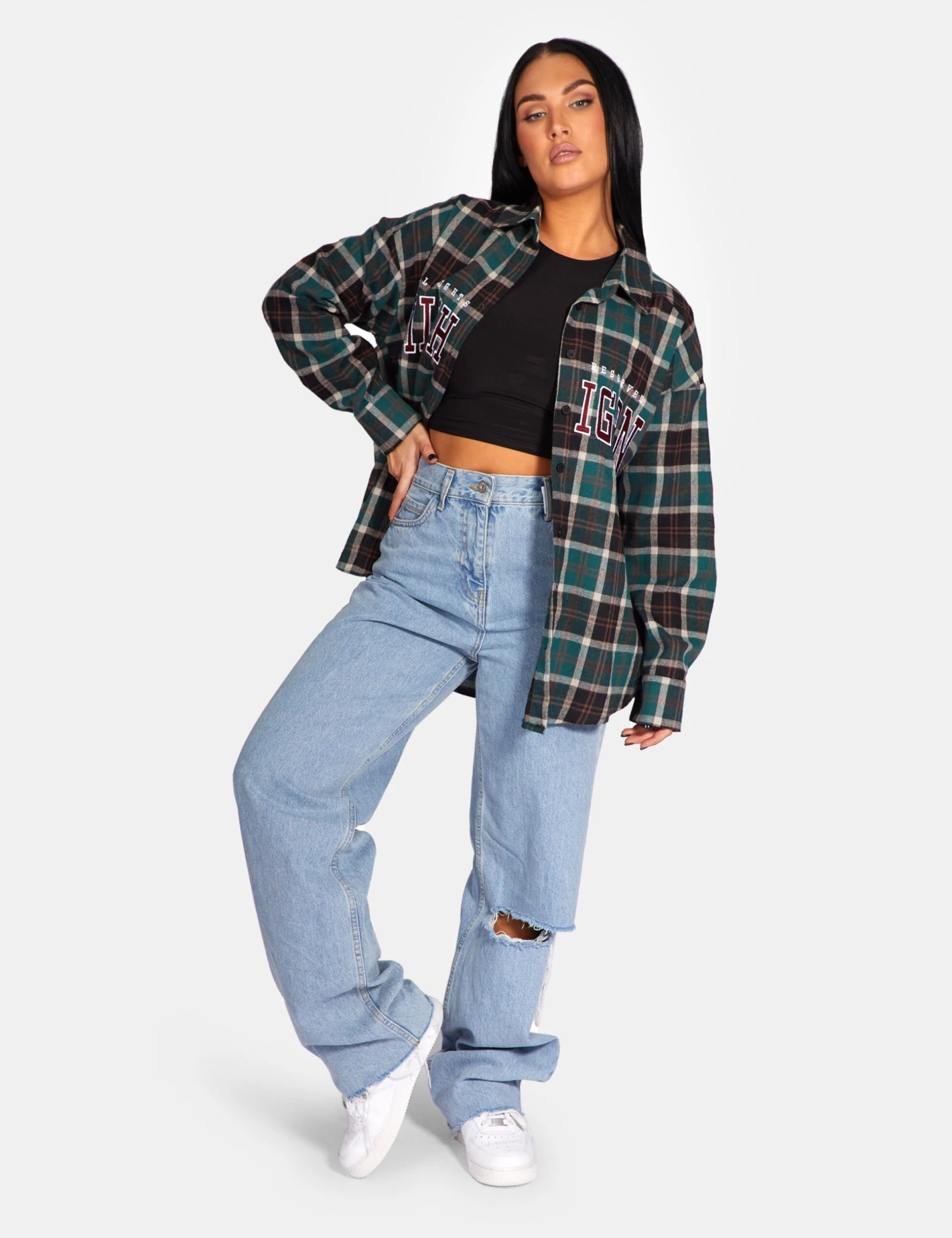 AN OVERSIZED FIT CHECK SHIRT IN FOREST GREEN WITH ‘MICHIGAN’ PRINTED ON THE FRONT.