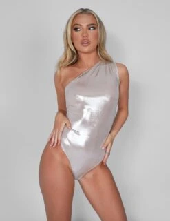 Dazzle and shine this party season with this fashionable one-shoulder ruched metallic bodysuit in the glamorous hue of champagne! This versatile top is sure to be the showstopper of your outfit – perfect for making an impact and turning heads! Get ready to rock the night with sparkle and shine!