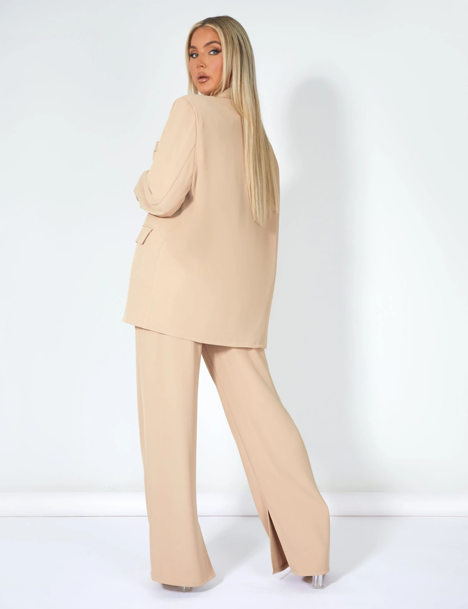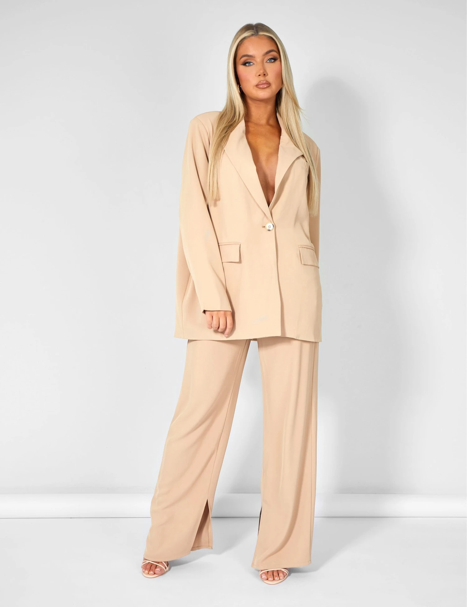 AN OVERSIZED FIT DAD STYLE BLAZER IN SAND NUDE. PAIR WITH THE SPLIT DETAIL HIGH WAISTED DAD TROUSER SAND FOR THE ULTIMATE SUIT SET.