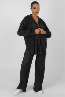 AN OVERSIZED FIT BUTTTON UP PLISSE SHIRT IN BLACK. WEAR AS A SET WITH THE OVERSIZED PLISSE CROP TOP AND PLISSE TROUSERS BLACK.