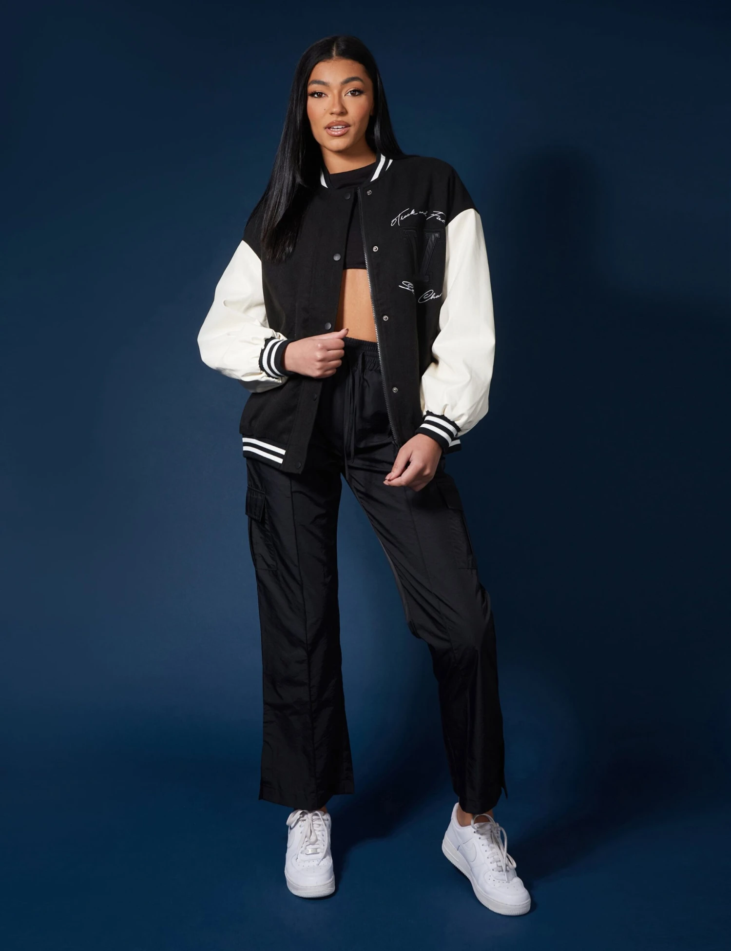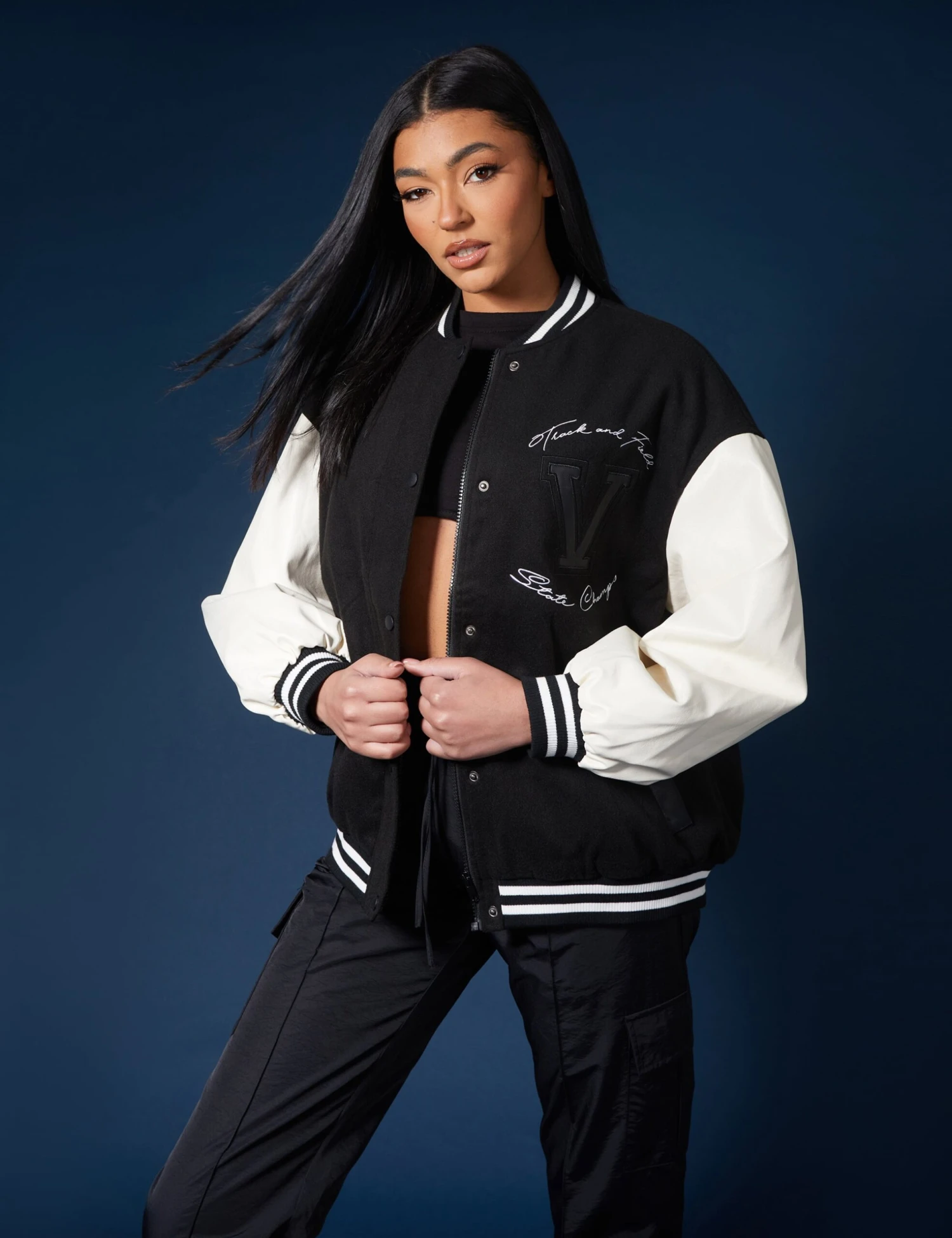 Layer up in style this Autumn with this oversized varsity jacket featuring a black body with black pu details and contrasting white pu sleeves.