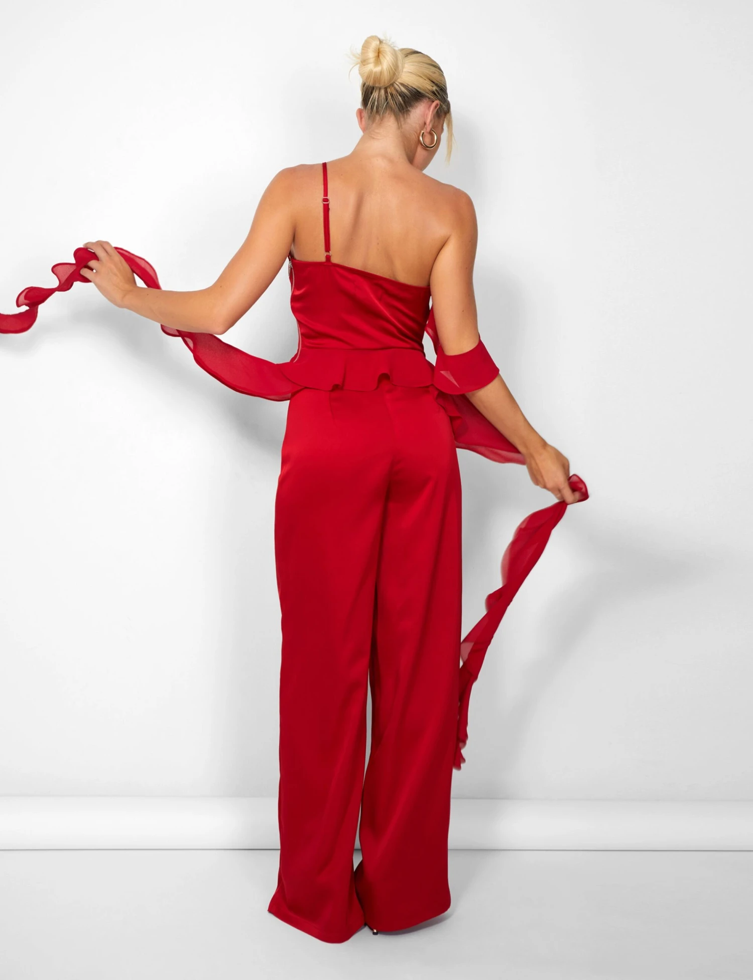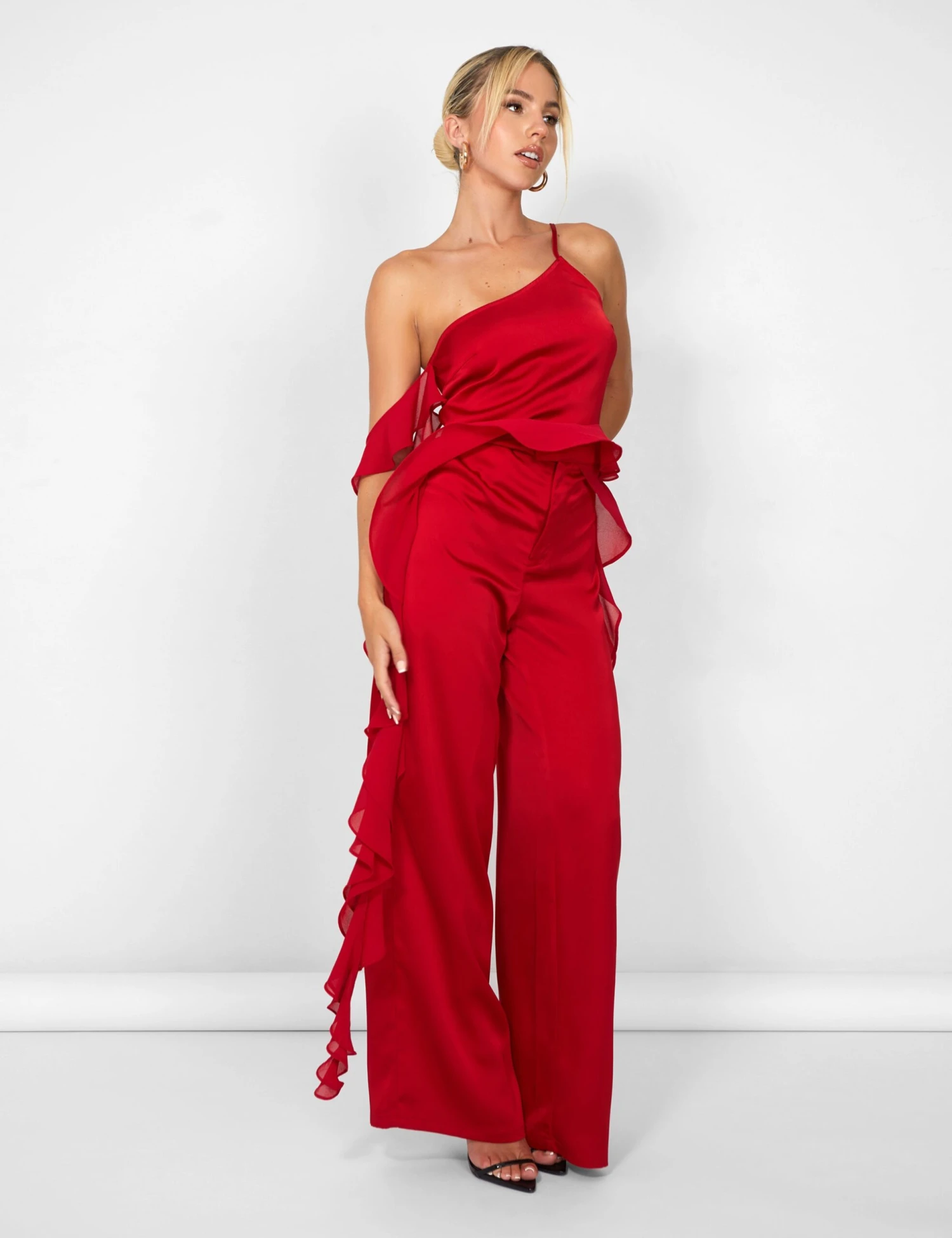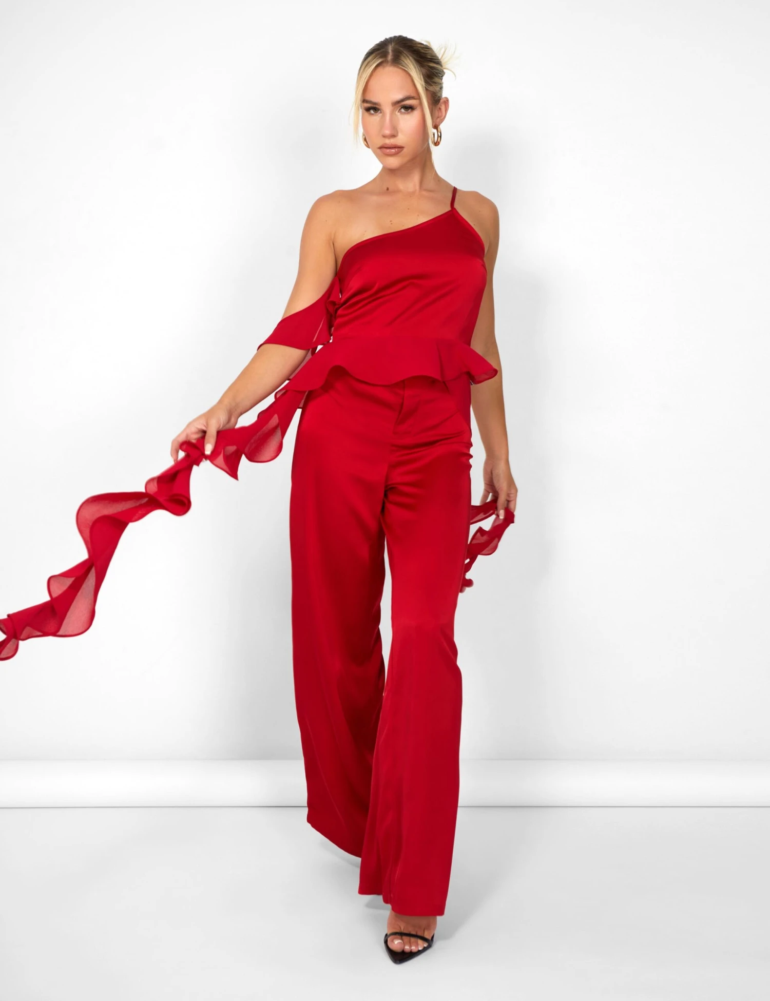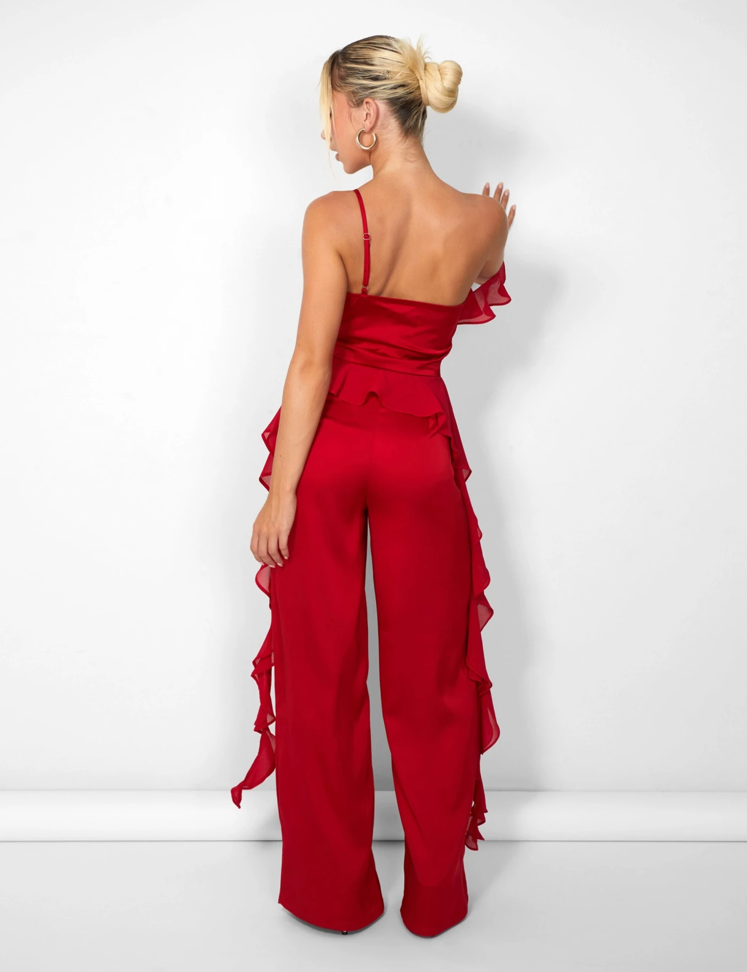 Put some serious “fire” in your wardrobe with the Kaiia Chiffon Ruffle Wide Leg Trouser in Red! So stylish they’ll be giving your friends “sly-envy”, this is the perfect co-ord to make ’em go “WOAH!”