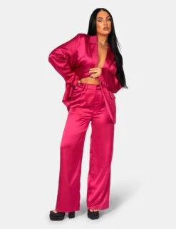 AN OVERSIZED DAD STYLE FIT BLAZER IN PINK SATIN WITH DYE TO MATCH BUTTONS.
