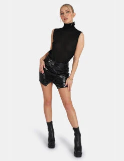 The ultimate roll neck top perfect for a night out made of a sheer knitted material featuring a high roll neck and no sleeves in black.