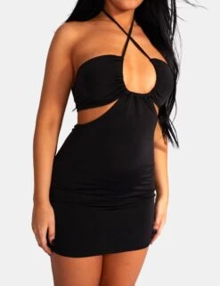 Update your LBD with this mini dress featuring a cut out loop detail, thin strap cross overs at the front and flattering ruching in a slinky material.