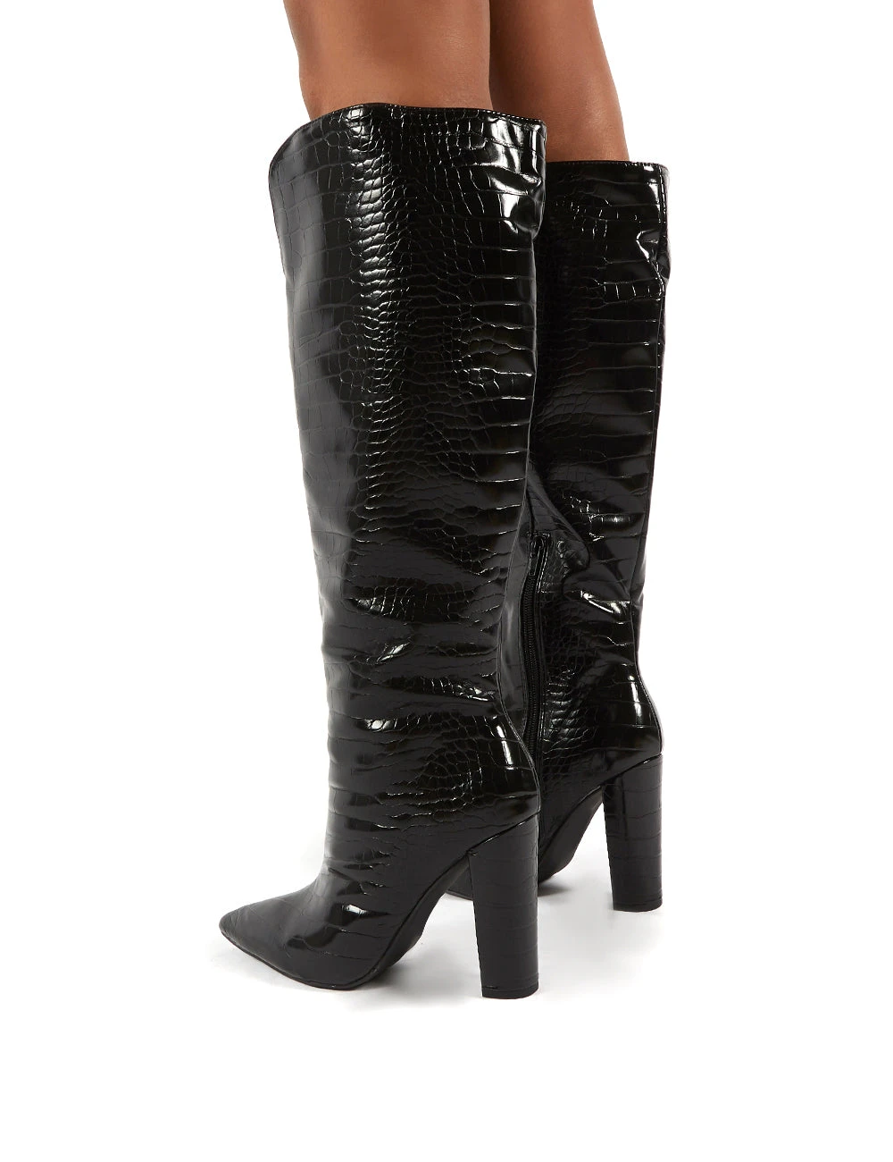 Slow features a croc print with pointed toe and block heel. These heeled boots will amp up any outfit!
