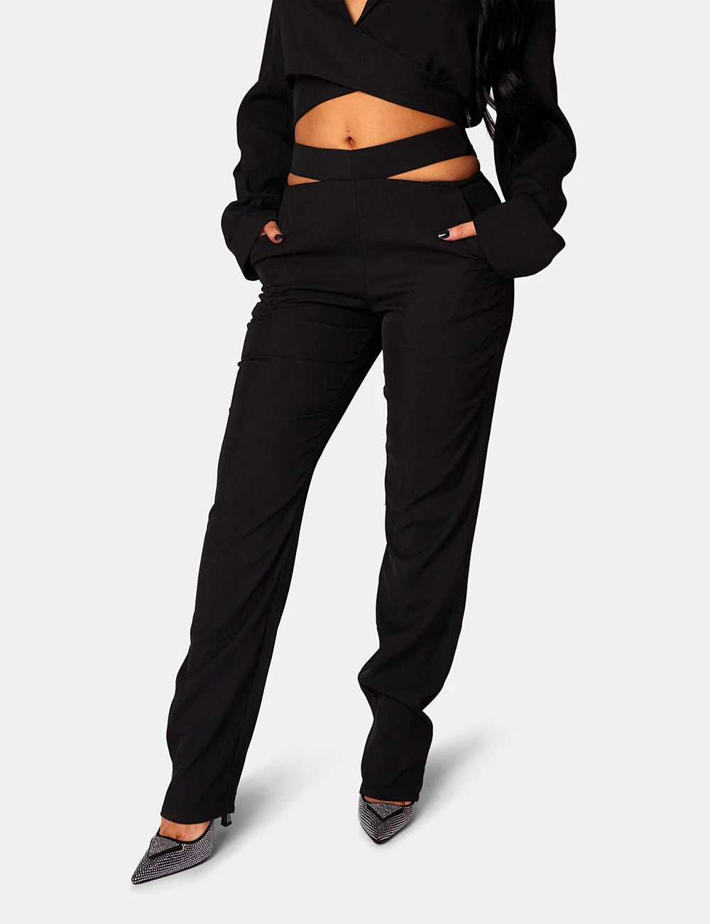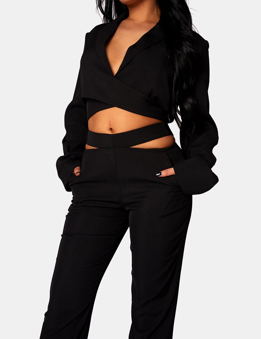 Cigarette style trousers in black featuring a strappy cross front wrap design.