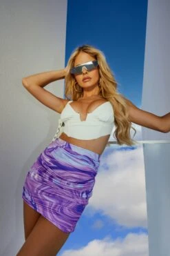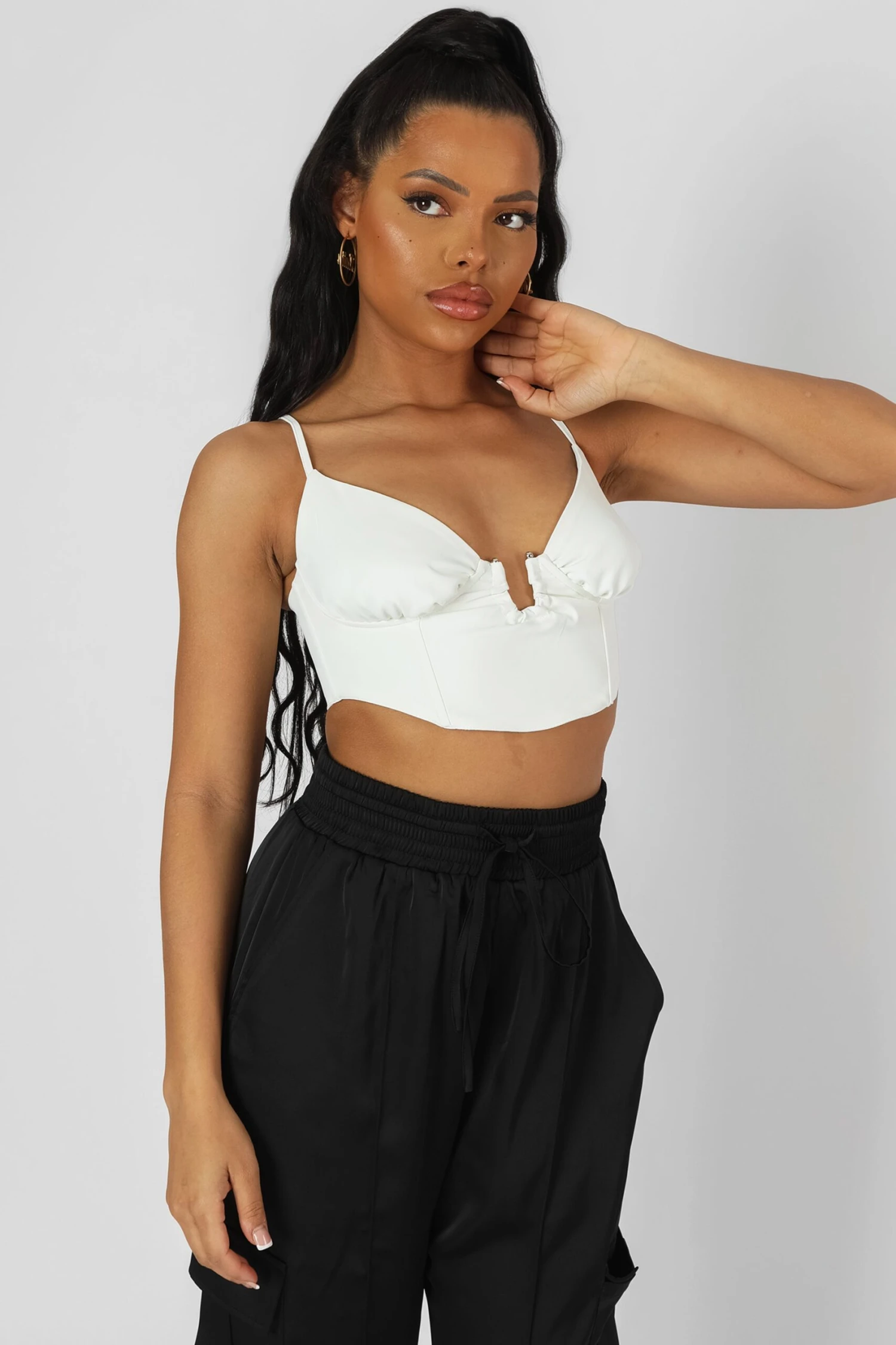 A BRALET CORSET IN WHITE IVORY WITH A U TRIM DETAIL AND A CURVED HEM.