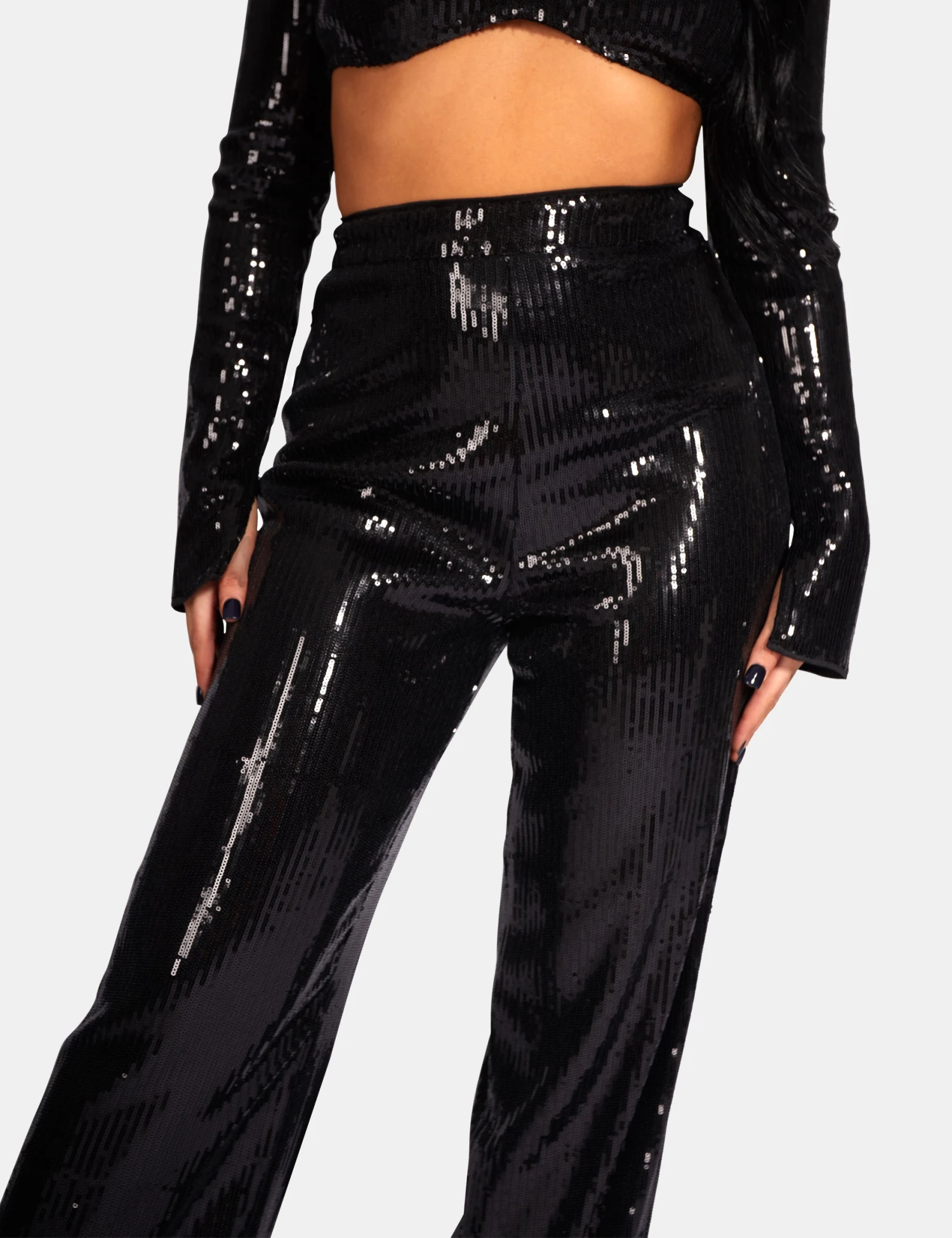 High waisted wide leg fully sequined trousers.