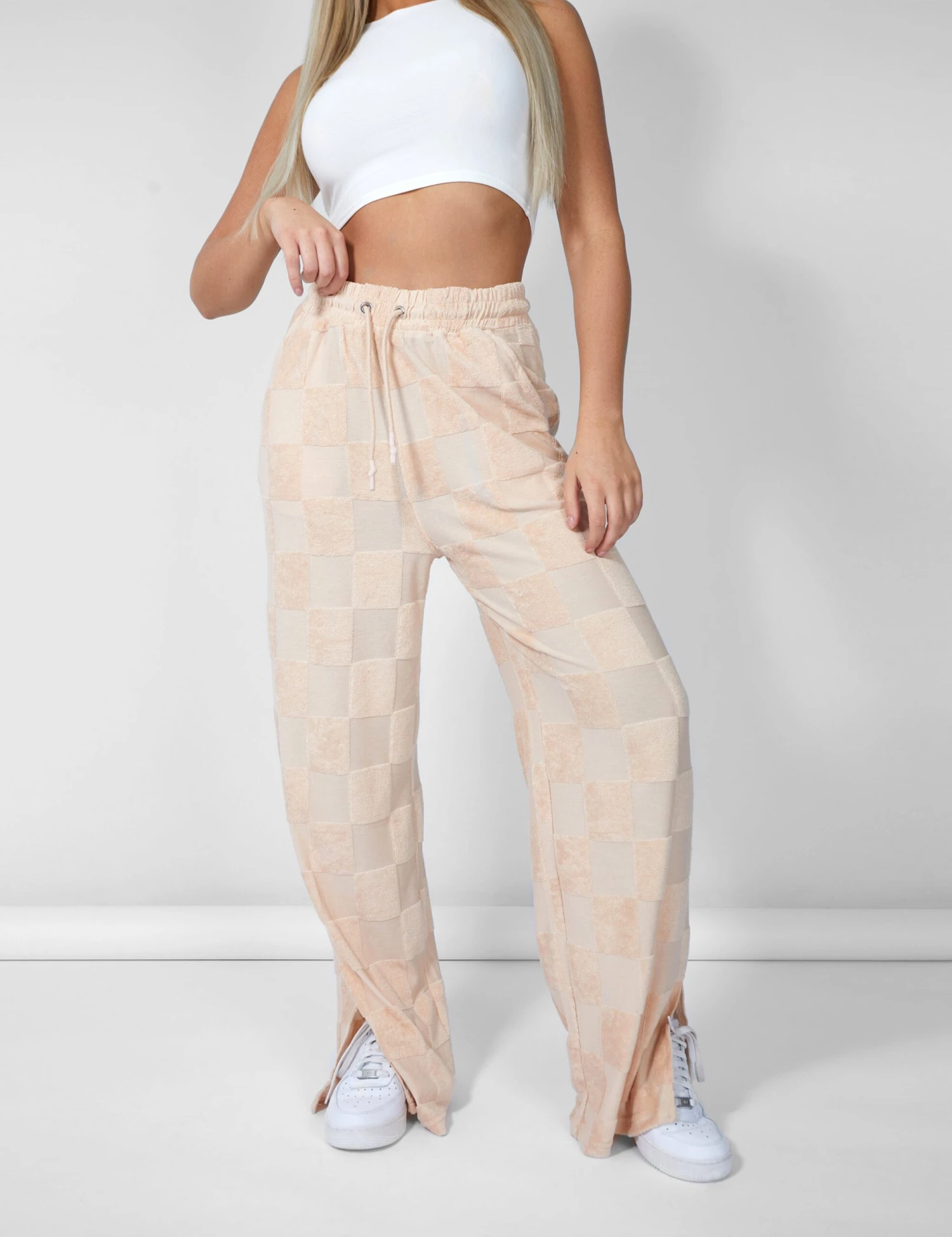 OVERSIZED FIT HIGH WAISTED DRAWSTRING STRAIGHT WIDE LEG JOGGER TROUSERS IN A SAND TONAL CHECKERBOARD TOWELLING PATTERN.