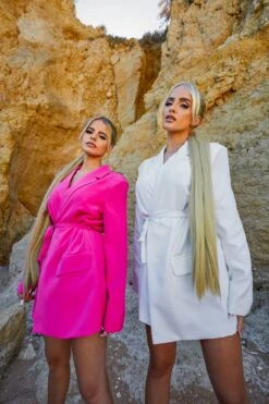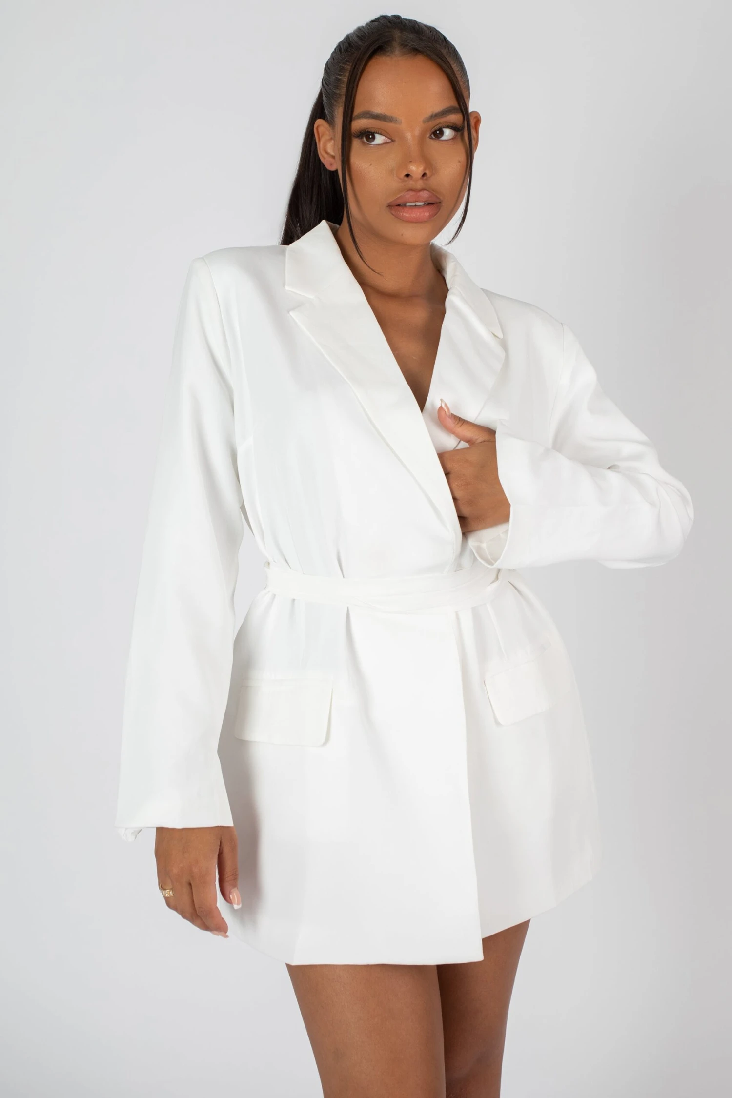 OUR ICONIC TIE WAIST MINI BLAZER DRESS NOW IN WHITE.